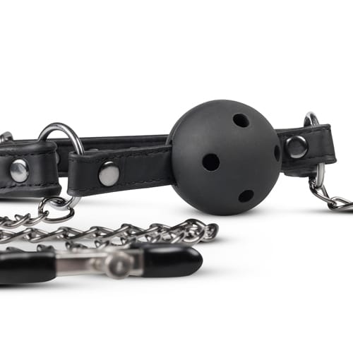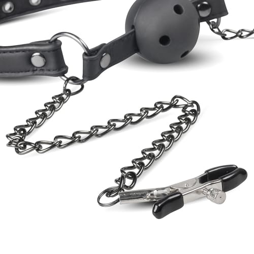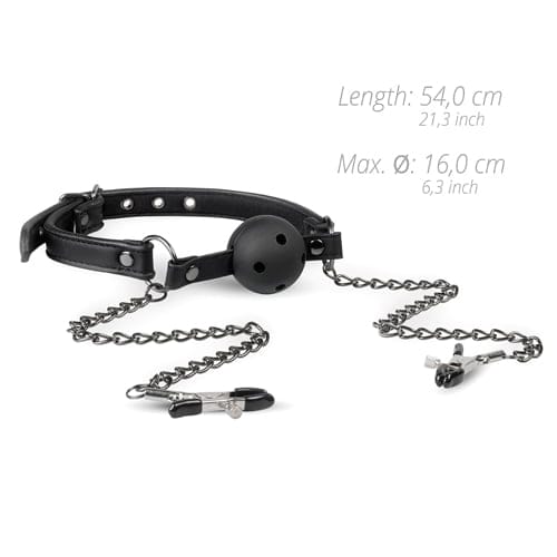 Ga op zoek naar het extreme met deze ballgag met tepelklemmen uit de EasyToys Fetish Collection. Deze zwarte ballgag is gemaakt van glad plastic. De bal is geur- en smaakloos en heeft luchtgaten. Hierdoor krijgt de drager voldoende lucht terwijl spreken onmogelijk wordt. De kunstleren band die achter het hoofd wordt gedragen is verstelbaar voor een perfecte pasvorm. Hieraan zitten de metalen tepelklemmen met kettingen. Ook de klemmen zijn verstelbaar voor een wisselende sensatie. diameter bal: 4,3 cm